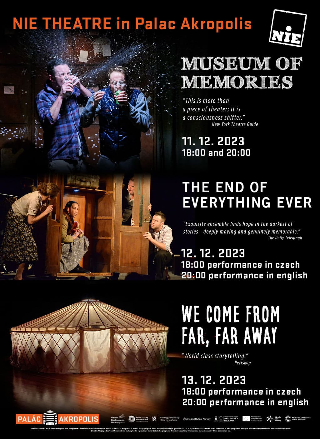 Profile of the work of NIE Theatre in the Palace Akropolis 11.–13. 12. 2023, will present a cross-section of the work of NIE in its width and its unmistakable artistic signature. The selected author’s productions are based on real stories. The selected productions have previously been presented separately by NIE in the Czech Republic, but they have never been part of a single guestplay.