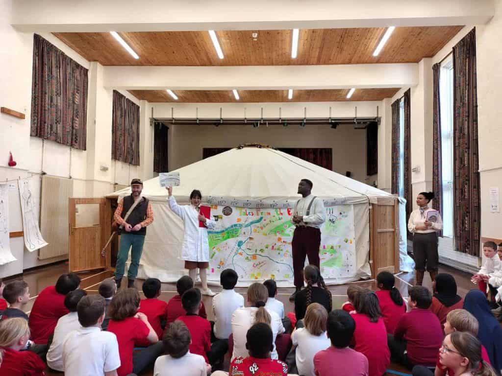 We were able to include the children’s animation work in the performance for the first time – projecting their film within the Yurt, rigging a big sail to the side and roof. In this clip, it is delightful to see the children’s heads bopping up and down at the bottom of the screen, so excited to see their work presented as a finished product in front of an audience.